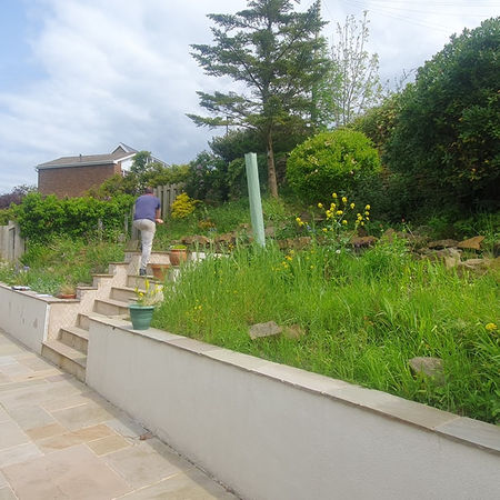 This garden presented significant access limitations: entry was via a steep drive and steps, with the garden itself continuing up a sharp incline away from the house.