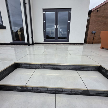 Storm White 600 × 900 porcelain tiles laid across the new patio area